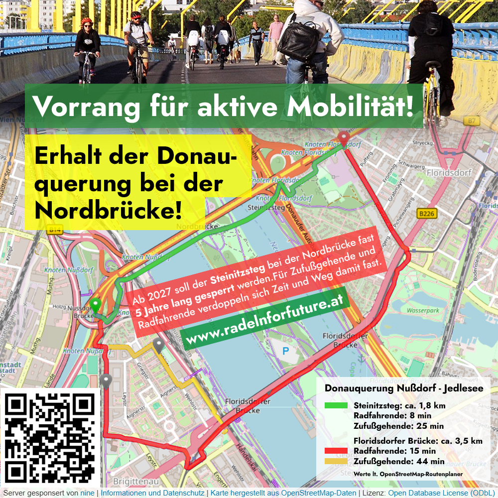 Ab 2027 soll der Steinitzsteg 5 Jahre lang dem Autoverkehr geopfert und für den Rad- und Fußverkehr gesperrt werden. Hintergrund ist die von der ASFiNAG angekündigte Sanierung der Nordbrücke. Die Folge sind fast doppelt so lange Umwege für Zufußgehende und Radfahrende.